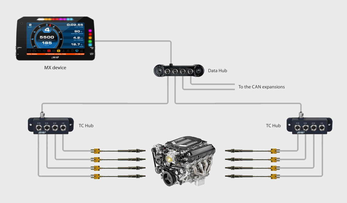 Con TC Hub se pueden conectar cuatro termopares adicionales a través de CAN a todos los sistemas AiM. Con más TC Hub, puede mantener fácilmente bajo control todos los datos de sus sensores de temperatura, monitoreando la temperatura de los gases de escape de cada cilindro, junto con las temperaturas del agua, el aceite y culata.